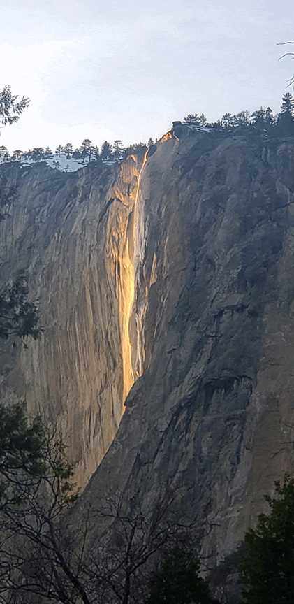 The most popular viewing spot, and the place NPS would prefer you gather, would be be near the El Capitan Picnic area. If you drive through before walking over there, you’ll notice groups of people gathered by the side of Northside Dr. That’s where you want to be! If you find a window between the trees where you can comfortably view Horsetail Falls, stick tight. You’re in a good spot. Make sure you are on the east side of El Capitan because while Horsetail Falls is viewable from places like El Capitan Meadow, the glow is not! You must be viewing from the right angle to catch the phenomenon in action.